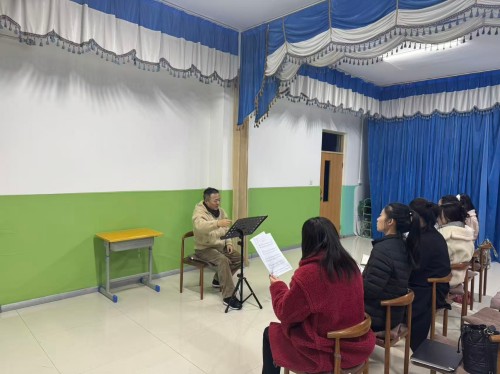 本次活动围绕音乐会作品《灯火里的中国》《映山红》展开,通过专家引领提升教师的合唱艺术理解与实践能力。刘世虎教授在培训中系统指导合唱团建立各声部的声音概念,从气息支持、共鸣运用与音色统一等方面进行针对性训练。结合两首作品的时代背景与音乐内涵,刘教授深入解读其创作语境与情感指向,引导教师在理解作品的基础上进行情境化演唱表达。在《灯火里的中国》中,注重声部层次与旋律线条的融合;在《映山红》的演绎中,强调情景与声部对比的表现力,使教师们在演唱中实现技术呈现与艺术表达的统一。